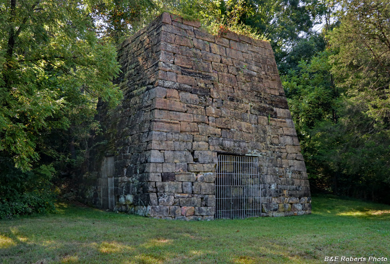 | Along my way, I stopped at a couple of Iron Furnaces, remnants of the 19th century iron industry. I've enjoyed these massive stone structures since first exploring the old Stamp Creek furnaces in Bartow Co., GA. 1. Glenwood Furnace, Rockbridge County, VA Glenwood Furnace, located near Natural Bridge, was built in 1849. The complex included the iron furnace, a casting house and other support facilities. The original cold-blast charcoal stack was 38 ft. high and 9 ft. across the bosh. A tub bellows powered by a waterwheel was set close to the stack; a raceway ran from Elk Creek to the waterwheel. Approximately 5,000 acres of forest were logged to supply charcoal to this furnace. The furnace was rebuilt and reconditioned in 1874 as a warm-blast furnace. The Glenwood Furnace (also known as the Cassandra Furnace) was abandoned in 1887. |